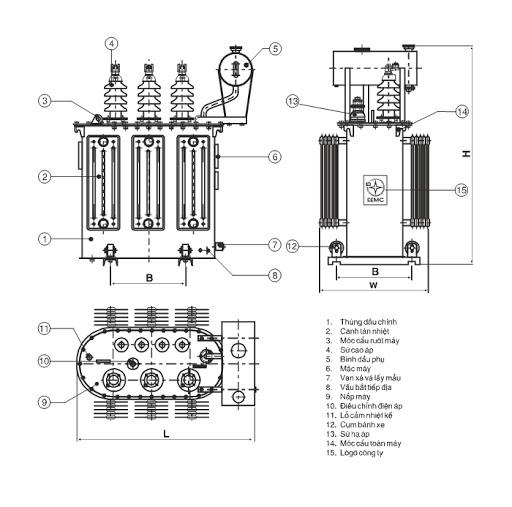 - Sản phẩm thuộc dòng máy biến áp ngâm dầu. Nó được làm mát theo cơ chế tuần hoàn tự nhiên bằng dầu và không khí (ONAN). Các cánh tản nhiệt tạo ra luồng gió để làm nguội.